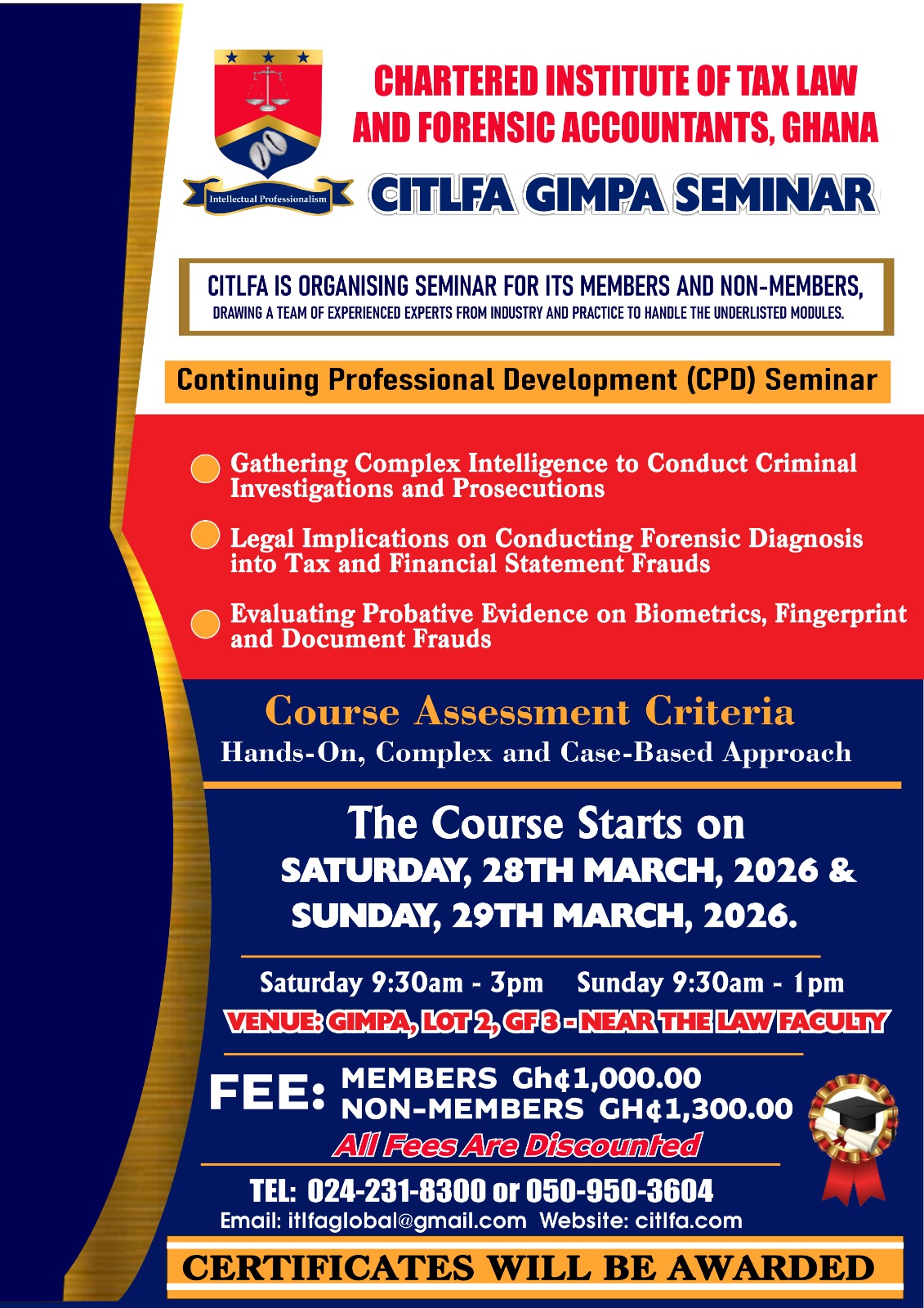 CITLFA is registered and regulated by Professional Bodies Registration Act, 1973 (NRCD 143) with the core mandate to train professional specialize in taxation, forensic accounting, and legal aspects of financial management. We are an institution dedicated to training professionals who safeguard organizations, strengthen compliance, and fight financial crime.